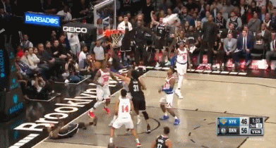 在比赛进行到第二节还剩1分多钟,篮网当家控卫凯里-欧文突破上篮受阻,并倒在地上,但是欧文抢到球权,同时向裁判示意尼克斯球员犯规。