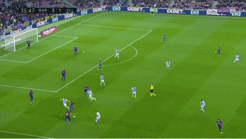 在中场右侧,梅西得到了比达尔的横传球。梅西左脚外脚背轻轻一拨,皮球就从对方10号普拉诺裆下穿过。梅西立刻带球突进,并且将球分到左前方的空当区域。