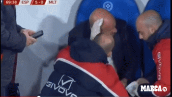 在昨晚的欧预赛中,西班牙7-0屠杀马耳他。马耳他不但输了球,主帅法鲁吉亚还挂了彩。在1分钟丢掉2球之后,法鲁吉亚一头撞在了替补席遮雨棚上,他的大光头被“开瓢”了。