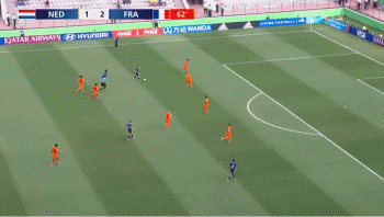 在第54分钟时,荷兰门将拉齐盲目出击头球解围不远。泰比胸部停球后选择横传左肋空当,穆伊加跟进推射破门,法国2-1逆转领先。