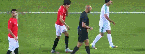 在小组赛第二轮中,伊拉克与也门对决。开场不到8分钟,就出现了这爆头一幕。亚贝尔高高抬脚,一脚踹到了阿尔哈格里的面部。