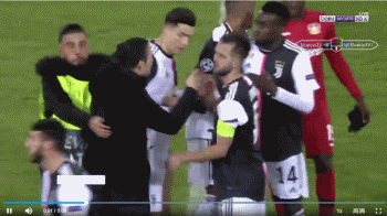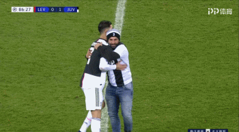 在第87分钟时,一名球迷冲入场内试图拥抱C罗。在他被安保人员拉走之前,C罗与他轻轻拥抱了一下。