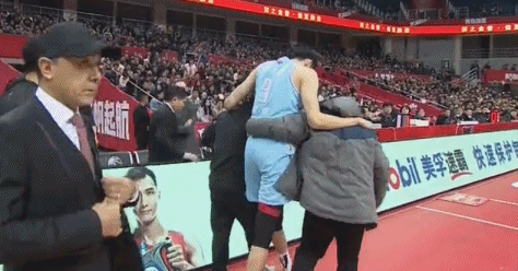 比赛刚刚开始没多久,在一次防守时,周琦起跳欲封盖对手,落地后倒地久久无法起身,最后被搀扶离场。