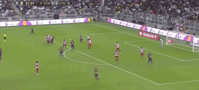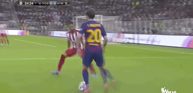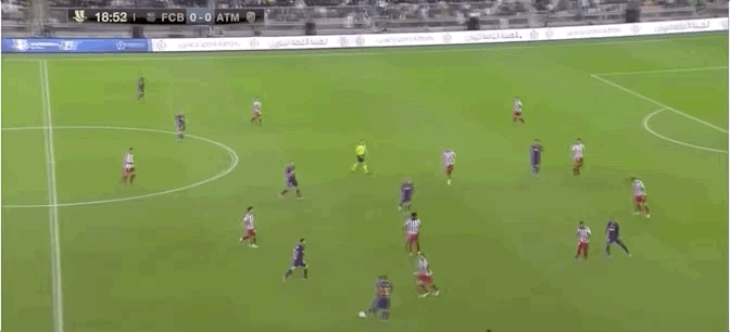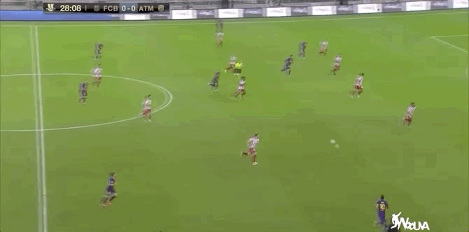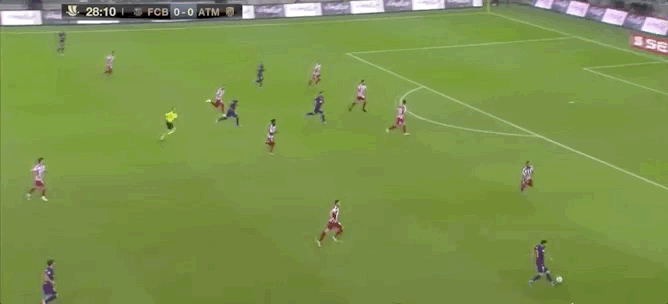 第28分钟,梅西右路带球内切在两名马竞队员之间穿过后射门,皮球高出球门。