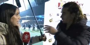 格列兹曼接受记者采访时,由于雨势较大,采访格列兹曼的女记者贴心为他撑伞,但格列兹曼一看雨伞较小,立马将记者手中的雨伞推回去,示意记者保护好自己不淋湿就可以了。