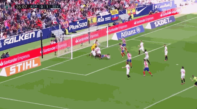 第27分钟,马竞右侧角球传中,制造塞维利亚禁区里混乱。菲利克斯门前近距离射门没能把球踢出,他和古德利身体接触后倒地,但他倒地后把球抱住,裁判吹比赛继续。