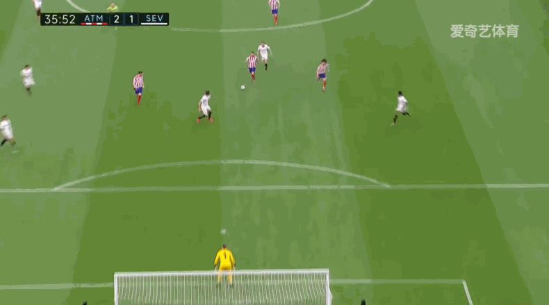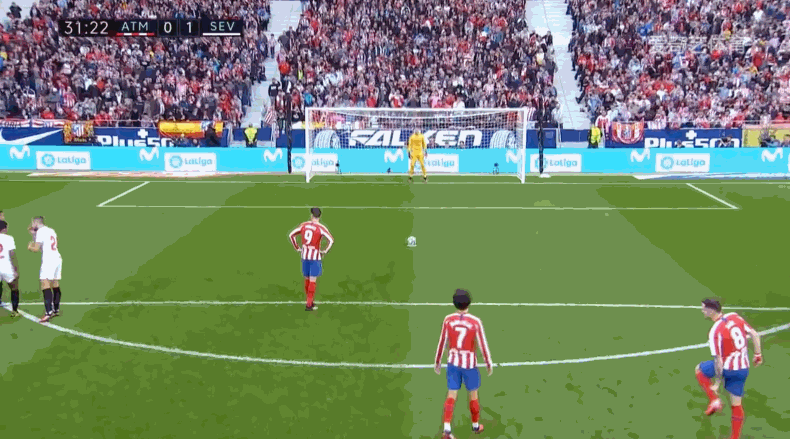 随后经VAR提示,古德利门前解围时踢倒了菲利克斯,但菲利克斯被侵犯前,卡洛斯手球犯规。主裁判埃尔南德斯跑到场边自己回看录像后决定判罚给马竞点球,并对卡洛斯出示黄牌。第32分钟,莫拉塔主罚点球把球推进塞维利亚球门左下角,打破了自己个人8场不进球的球荒,1-1。