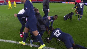 在主裁吹响终场哨声的一刹那,巴黎球员们狂奔入场庆祝。在这一瞬间,球员们终于可以暂时卸下多年来背负的巨大压力了。在连续3年欧冠首轮出局后,巴黎终于不用再当16郎了!