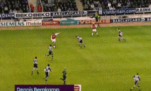 足球场上任何细微的空间都逃不过他眼睛,有时你甚至需要通过好几次回放才看清他究竟做了什么。1997年8月27日,阿森纳3-3战平莱斯特城的比赛中,博格坎普打入的第3粒进球就是一个典型案例:当时他迎着大卫-普拉特的中场长传球往对方禁区左侧奔跑,之后在将来球在空中连续用左右脚颠过了一名防守队员,最后将球吊进球门后角。当然,他这场的3个进球,一个比一个艺术,英超单月最佳进球前3都是他。