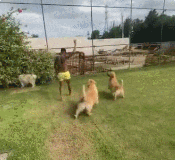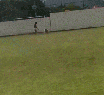在自家巨大的球场上,内马尔赤脚赤膊和三头金毛玩耍。从左侧球门处,内马尔靠速度生趟爱犬,然后将球送入空门。在带球过狗并进球之后,内马尔甚至还举起双臂进行庆祝。