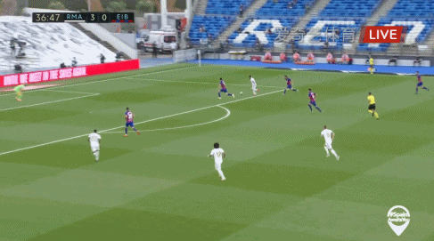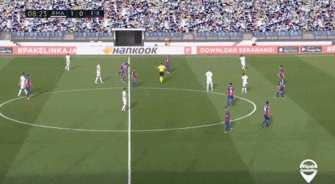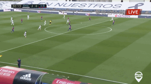第30分钟,本泽马在左路拿球后斜传,阿扎尔反越位成功,在禁区右侧单刀面对埃瓦尔门将德米特洛维奇,但阿扎尔没有贪功射门,而是选择横传给后点的拉莫斯,随后皇马队长拉莫斯轻松射空门得分。