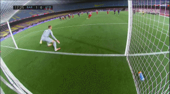 15分钟卡拉斯科左路突破皮克后杀入禁区被比达尔绊倒,迭戈-科斯塔右脚低射被特尔施特根扑出。特尔施特根提前双脚离线,主裁出示黄牌并要求重罚点球,皮克抗议判罚也被黄牌吃到黄牌。萨乌尔左脚将球推入球门右下角。1-1,马竞扳平比分!22分钟比达尔右路横传,梅西禁区右上角兜射,皮球滑门而过。