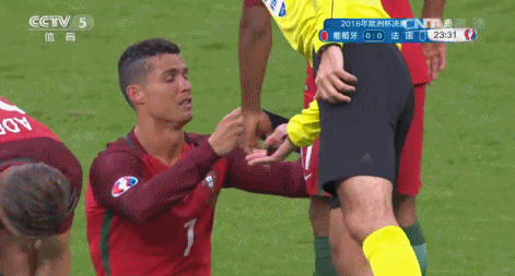 决赛场上,C罗第23分钟膝盖受伤,在离场前他把曾经摔在地上的队长袖标交给了纳尼。