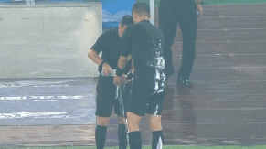 面对如此情况沈寅豪没有慌乱,暂时吹停比赛后,他跑到场边在第四裁判的帮助下简单进行了清理,之后他也赶紧回到场上继续吹罚比赛。