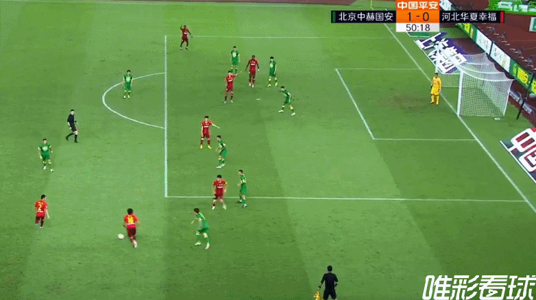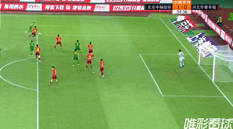 上半场哨响开始,第4分钟,金泰延左路突破后传中,皮球打在冯刚脚上,折射后飞入远角网窝,北京国安1-0河北华夏!