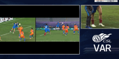 第35分钟,周定洋禁区内防守佩莱过程中,皮球打在周定洋的前臂上,主裁判回看VAR后认为不存在点球。