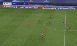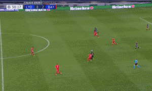 从上图可以看到,在拜仁面对中路限制分边配合之后,蒂亚戈就获得了空位接球的空间。面对前提上来逼抢的卡奎雷特蒂亚戈完成了过人,然后,能通过分球联系中路的空位队友。这是里昂高位限制带来的隐患展现。但是,他们通过快速的拦截抓住了蒂亚戈分球力量稍小的机会形成断球,一个长传找到德佩获得了单刀机会。可惜,面对诺伊尔的出色移动以及较大的封堵面积,第一下“顺球”不算好的德佩浪费了单刀的机会。