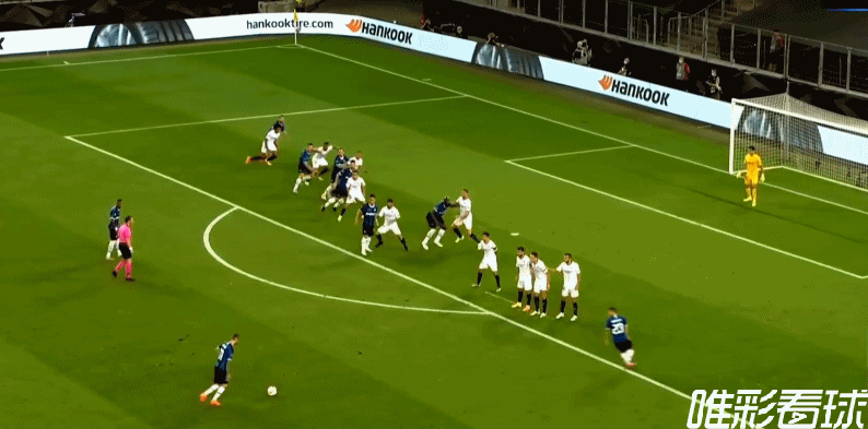 第36分钟,国米第2球!戈丁!弧顶右下定位球布罗佐维奇斜搓,戈丁力压后卫冲顶追平!国米2-2塞维利亚!