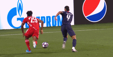 此番登场的科曼,在多数情况下(尤其是持球压制阶段)走位完全“佩刀化”,内收吸引对方防守。而且,他正统边锋的走位可以保证前场的宽度,让A-戴维斯不用过分前插,以便更多协防后场,防止大巴黎三叉戟的冲击。
