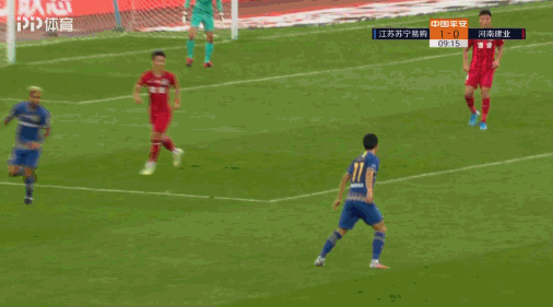 第9分钟,江苏苏宁打破场上僵局,右路大范围转移到左路,谢鹏飞停球后斜传门前,桑蒂尼高高跃起甩头攻门破门!江苏苏宁1-0领先!