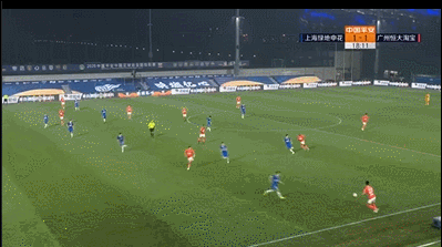 第13分钟,申花后场解围角球后打出反击,于汉超后场右路送出远距离的斜长传,钱杰给右脚奋力停球后形成单刀球,最终禁区外面对刘殿座右脚打门被封堵。