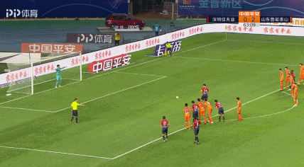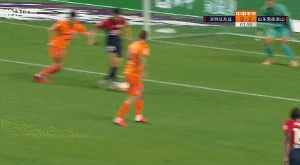 第61分钟,葛振禁区右侧横敲,郜林门前射门被刘军帅封堵,郜林再拿球被刘军帅铲倒,主裁判罚点球;郜林第64分钟主罚点球骗过门将推入球门右侧死角,深圳1-2扳回一球。