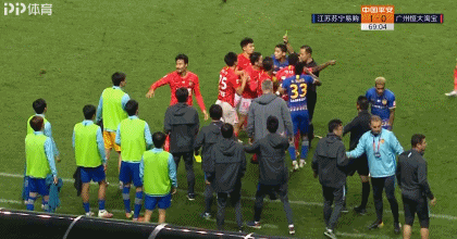 随后替补席队员纷纷起身,围上前去理论,部分恒大球员也过来劝阻,场面一度失控。甚至恒大主帅卡纳瓦罗为避免冲突升级,冲进场内训斥自己的球员,并用力推开情绪激动的何超、费南多。