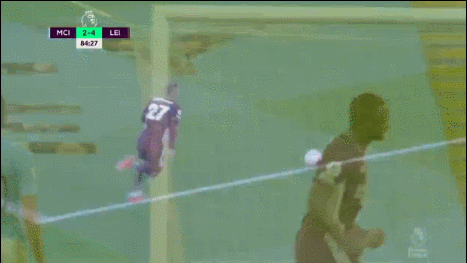 第77分钟,场上比分再度被改写,麦迪逊前场左路横向盘带,随后忽然抡起大脚轰出一记惊人的世界波,莱斯特城锁定胜局,4-1!第81分钟,沃克中前场右侧持球推进后忽然起脚爆射被封堵。第84分钟,斯特林任意球打门被瓦尔迪顶出底线,曼城获得右侧角球,马赫雷斯主罚将球开到禁区中路,阿克头球攻门得手,曼城扳回一球,2-4!