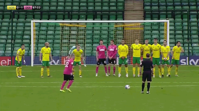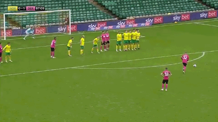 这场对决的重要性不言而喻,但两队都迟迟打不开僵局,直到比赛进行到第87分钟的时候,德比郡获得任意球,站在球前面的正是前曼联功勋射手鲁尼。而对于破门机会,鲁尼没有放过,只见鲁尼没有做过多的起跑动作,稍作调整后,用右脚踢出一记漂亮的弧线,皮球如巡航导弹般精准绕过诺维奇队员排出的人墙,擦着对方立柱,直接飞进球门死角。