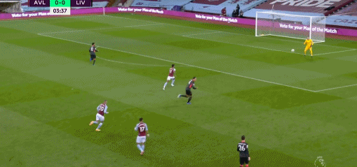 第7分钟,维拉左路发动进攻,格拉利什直塞至禁区,巴克利拿球后扫射,皮球稍稍偏出右侧立柱。第15分钟,红军卷土重来,菲米面对门将的射门被扑出,萨拉赫在争抢中倒地,裁判未予表示。第21分钟,菲尔米诺突入维拉禁区,闪转腾挪后的左脚射门被马丁内斯化解。