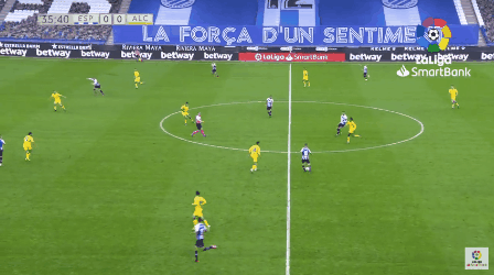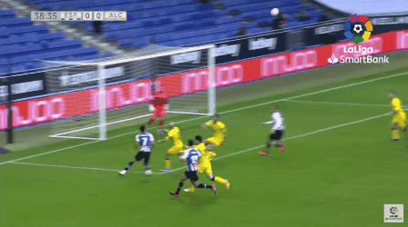 此后武磊继续投入比赛,并在第34分钟觅得良机。西班牙人中场左路高空球长传,德托马斯前插到禁区右侧得球后起脚抽射,球被门将达尼-希门尼斯扑出。尽管武磊迅速跟进倒地补射,但是在对方后卫回追干扰的情况下没有打上力量,球又被门将没收。