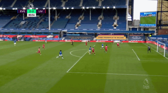 第80分钟,埃弗顿发动快速反击,迪涅左路下底传中,勒温禁区中路高高跃起头球攻门,皮球越过阿德里安十指关飞入球网,2-2,埃弗顿扳平比分。