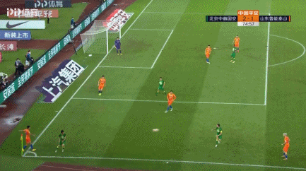 北京时间10月22日19时35分,2020赛季中超联赛第二阶段争冠组首轮北京中赫国安与山东鲁能泰山队的次回合比赛在苏州市体育中心进行。第75分钟,张弛角球区附近回传失误,奥古斯托左边路断球后斜塞禁区左侧,张玉宁接球转身小角度面对门将左脚捅射,皮球从球门近角进入球门,国安2-1领先,总比分4-3领先。