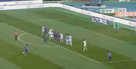 第28分钟,宋岳距离球门25米任意球直接射门,张翀奋勇将球托出横梁。