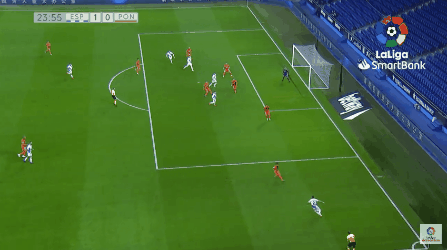 第24分钟,西班牙人打破僵局,这次又是右翼的米格隆在接到大范围转移后发起进攻,他先是连续突破至禁区内,随后回传给弧顶处的达德尔,后者直接将球传至禁区后点,无人盯防的德托马斯凌空垫射破门,1-0!3分钟后,大卫-洛佩斯接恩巴尔巴的前场右路任意球头球攻门,皮球被对方门将卡罗得到。