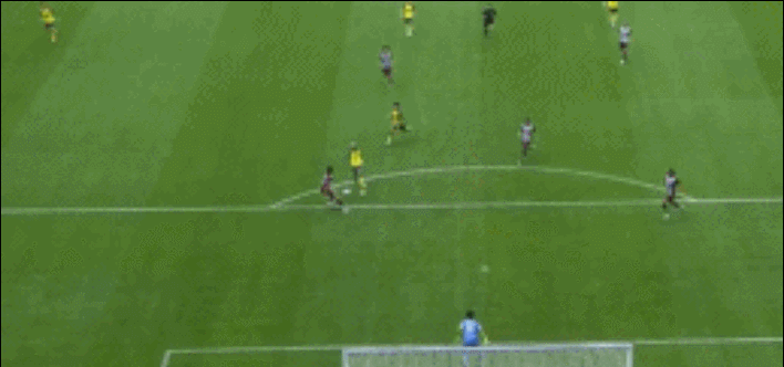 补时第2分钟,伊涅斯塔右路任意球传入禁区,道格拉斯中路原地头球高出横梁。
