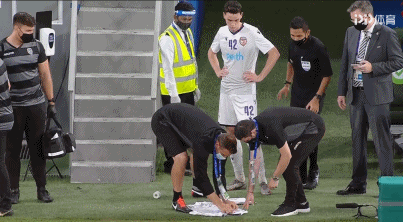 珀斯光荣球员尼古拉斯-沃尔什的球衣上有血渍,需要更换球衣,但是队中没有多余的球衣,助教拿来胶布粘也粘不上……