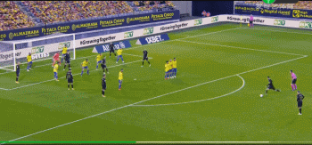 通常情况下在防守任意球时,其他防守球员会与人墙站成一条横线。如此一来,就不太容易给攻击方补射机会。补射方一旦站位超过人墙,那就是越位。但在防守梅西这次任意球时,加的斯竟然全部11名球员都收缩在禁区内。3人组成人墙,一人站在点球点附近,两名在门线上站在门将身旁,其他球员则全都在小禁区内。通过这种方式,加的斯切断了梅西几乎所有射门路线。加的斯宁可给巴萨球员补射机会,也不想让梅西直接任意球破门。梅西这次射门,最终被对方门将扑出。