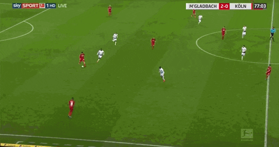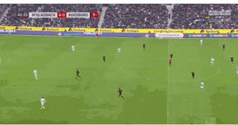 而在前场进攻里,与大多数球队边锋/边前卫都会拉开进攻宽度不同,门兴往往是两个边前卫同时向内收,和前腰以及冲上来的扎卡里亚形成局部人数优势,通过小组配合直接把球送进禁区。边路基本全留给边后卫套上,保证传中时禁区中央和肋部都有接应点。