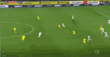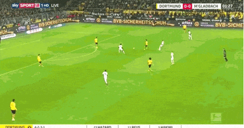 此时,对方基本会把球传到空位的边后卫那里,再沿着边路推进或者和中场建立联系。这时,门兴本方的边后卫和这一侧的后腰往往会快速上抢,通过包夹防守来完成断球,就像下面这样。