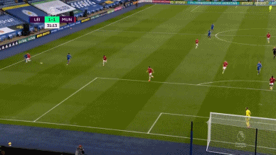 曼联后防集体愣神,巴恩斯获得绝佳射门良机,为莱斯特城扳平比分。