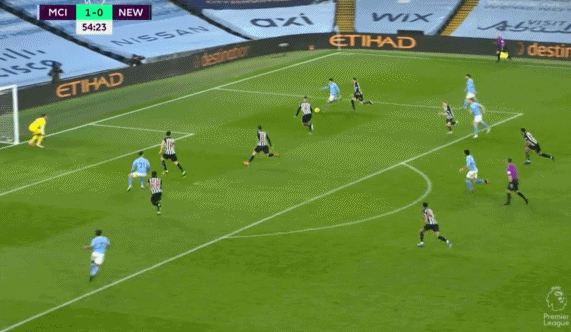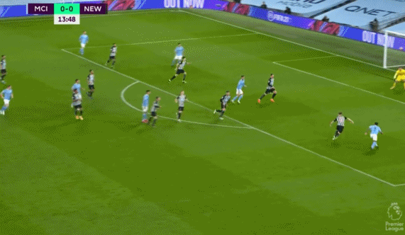 第24分钟,德布劳内中后场左侧直塞,费兰-托雷斯持球推进杀入禁区后右脚打门被达尔洛没收。第35分钟,费兰-托雷斯中圈过顶挑传,德布劳内单刀杀入禁区面对出击的达尔洛右脚劲射被挡。第37分钟,坎塞洛弧线球挑传禁区右侧,斯特林插上小角度右脚打门被达尔洛扑出。上半场比赛结束,曼城1-0暂时领先于纽卡斯尔。