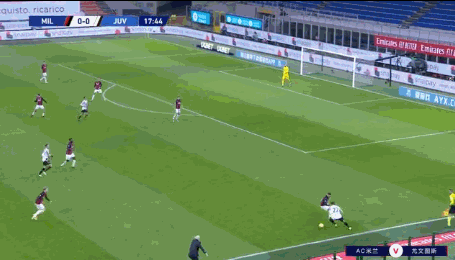 第62分钟,迪巴拉前场中路拿球,分给禁区前右侧的基耶萨,后者内切后的左脚推射,皮球直奔球门左下死角,尤文2-1米兰。