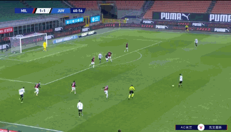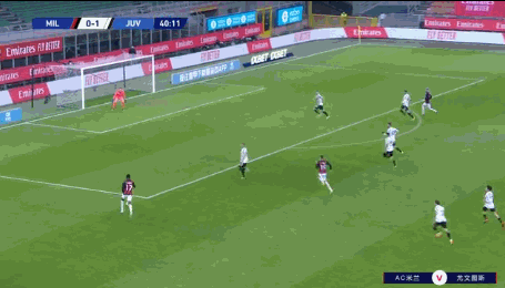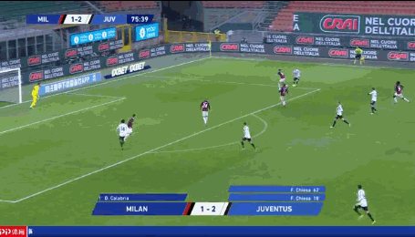 第41分钟,拉比奥前场带球倒地被断,莱奥前场左侧奔袭后送出横传,禁区中路卡拉布里亚不停球兜射打入球门右上角破门,米兰1-1尤文扳平比分。