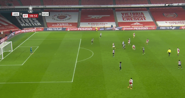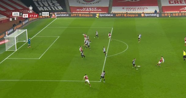 常规时间比赛结束,阿森纳0-0战平纽卡,双方进入加时赛。第94分钟,扎卡禁区前凌空抽射,被门将飞身扑出底线。