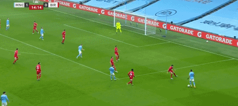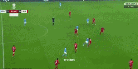 在35分01秒时,德布劳内完成了第一次大师级直传。在一直被防守球员推搡的情况下,德布劳内中圈顶定左脚送出贴地直传,皮球直接打穿了伯明翰整条防线。热苏斯禁区左侧单刀挑射,可惜被补防的后卫在门线前解围。