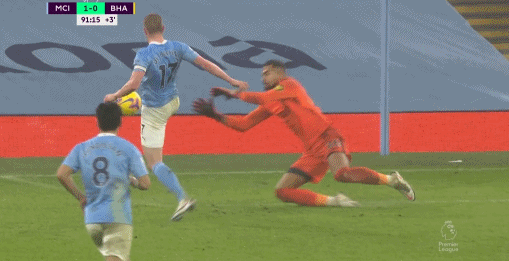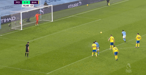 终场伤停补时阶段,桑切斯禁区内放倒德布劳内,当值主裁果断判罚点球,斯特林主罚右脚爆射放了一脚高射炮,曼城再度错失扩大比分良机。全场比赛结束,曼城主场1-0小胜布莱顿。