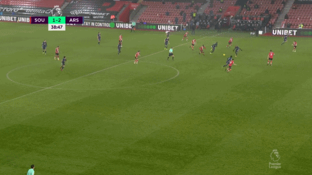 第38分钟,莱诺长传,扎卡得球后传给拉卡泽特,拉卡泽特直传,萨卡禁区外过掉出击的门将后推射射进空门,1-2,阿森纳逆转比分。半场战罢,阿森纳2-1领先圣徒。