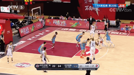 首节比赛战至1分48秒,陈盈骏持球杀到底线附近,将球向右侧分出。但由于传得太高队友没法接到,球直接出界失误。站在场边的解立彬侧身一闪,伸手将这个球稳稳接住。