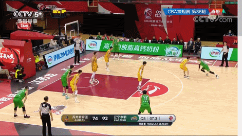 第三节,江苏队进攻时间仅剩下1秒,王洪底线球发到中路,吴冠希空接接球空中失去平衡,中投压哨命中。本节最后4.4秒,郭艾伦单挑江苏的防线,一个背转身后打板命中造2+1,同样完成高难度得分。